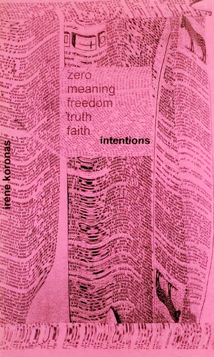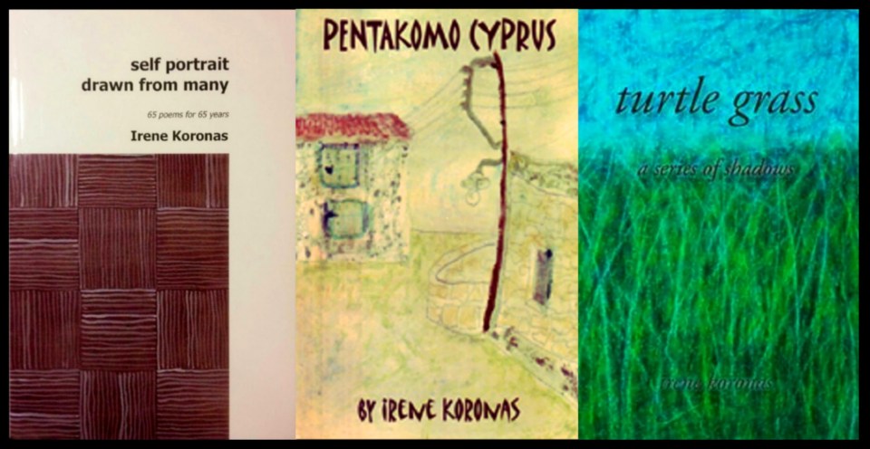 Irene Koronas’ poetry collections includes turtle grass: a series of shadows (Muddy River Books, 2014), Emily Dickinson (Propaganda Press, 2010), Pentakomo Cyprus (Červená Barva Press, 2009), Zero Boundaries (Červená Barva Press, 2008), close to flat (2008), self portrait drawn from many (Ibettson Street Press, 2007), Flat House (ordinary press, 2006) confession in 64 parts (ordinary press, 2005) and Species (2005).